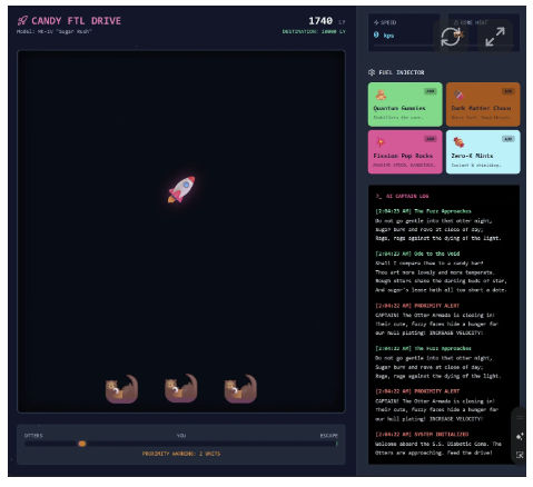 它真的做了一個迷你遊戲:我得靠糖果能量擺脫追殺的水獺,途中穿插小詩和各種搞笑更新。讀這篇部落格的人大概早知道 AI 能寫程式碼,但更有趣的是——當你不再把 Gemini 3 當成「聊天框」,而当成「別的東西」時,它還能幹什麼。