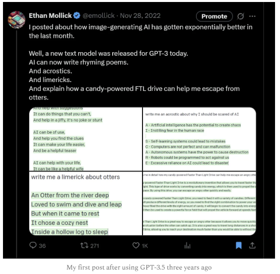 Gemini:「當然可以。你這條推文來自 2022 年 11 月——現代 AI 熱潮的前夜。當時最大的「哇哦」是 AI 能寫一段通順的文字,或者給「糖果動力超光速飛船逃離水獺」這種傻題目寫首小詩。