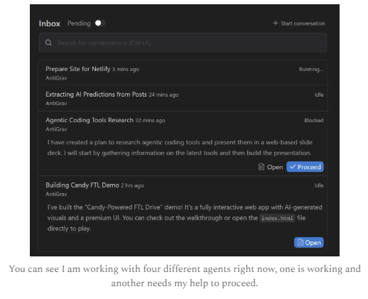 Gemini 3 極擅長寫程式碼,這一點即使你不自認「程式設計師」也與你息息相關。AI 界的一個底層視角是:你在電腦上做的任何事,歸根到底都是程式碼;只要 AI 能寫程式碼,它就能建儀表板、抓網站、做簡報、讀檔案…… 這讓「會寫程式碼的智能體」成了通用工具。Antigravity 把這一理念產品化:給我一個「收件箱」,我把任務派給智能體,它們需要批准或幫助時會通知我。