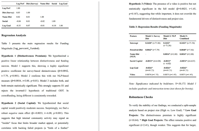更驚豔的是,它自創了一個指標:用 NLP 把專案描述與海量描述做數學比對,衡量「眾籌創意獨特性」。程式碼自己寫,結果自己驗。