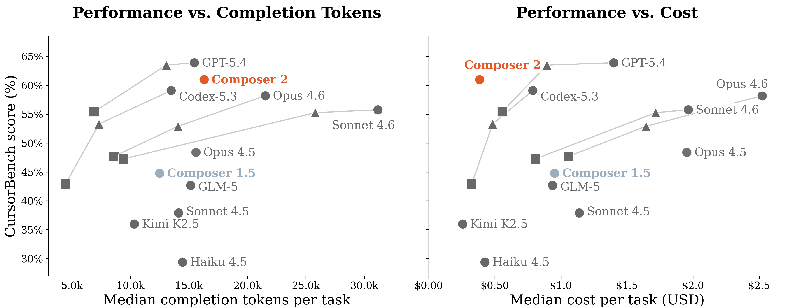 Composer 2 は、エージェント型ソフトウェアエンジニアリングのために設計された専門モデルです。このモデルは、対話的な使用のために問題を効率的に解決する能力を維持しつつ、強力な長期的計画性とコーディング知能を実証しています。このモデルは、実世界のソフトウェアエンジニアリングに関する当社のベンチマークである CursorBench において高いスコアを記録し(図 1 参照)、SWE-bench Multilingual [28] や Terminal-Bench [39] などの公開ソフトウェアエンジニアリングベンチマークでも最先端レベルのスコアを達成しています。